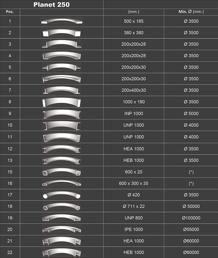 The six way hydraulically adjustable guide rolls design assure the best guiding of the section in and out coming the bending rolls. Mainly used for avoiding shape deformations of asymmetric sections, thanks to their large and powerful design the can be used to enlarge a too small diameter or to calibrate the bending radius.